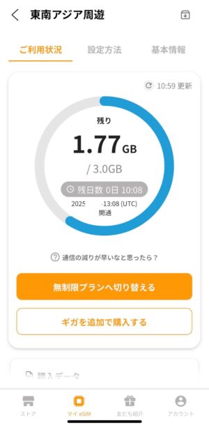 いざ旅が終われば、5日間の旅行が終了した時の残データ容量は1.77GBでした。