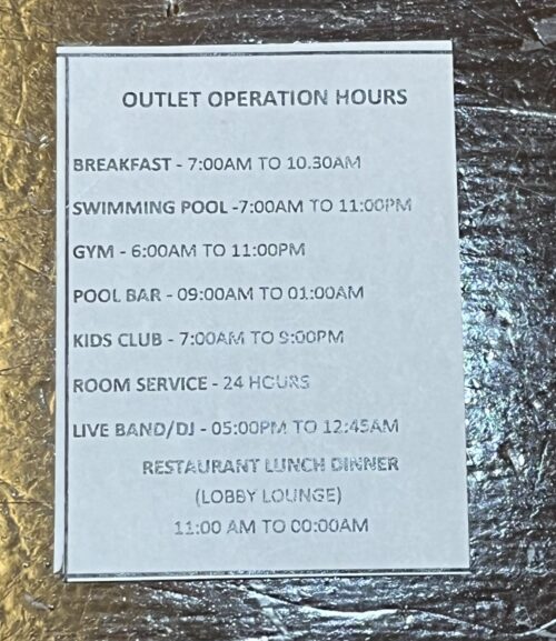 チェックイン時に、各施設の営業時間が書かれた紙をいただくことが出来たのでこちらに掲載させていただきます。