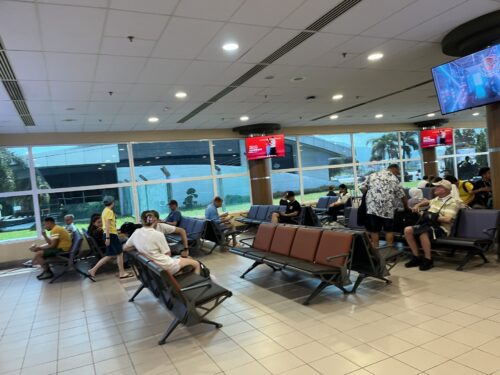 リゾート地とはいえ島の空港になるので、中は簡素な造りで搭乗口の待合は狭いです。