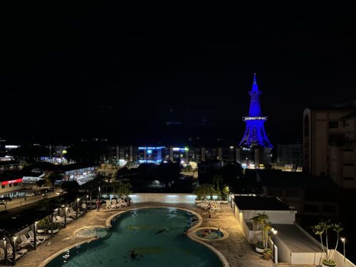 夜になると、奥に見えるタワーがライトアップされて幻想的な景色に早変わり。
