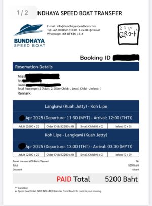 ☑︎Bundhaya Speed Boat(Kuah↔︎Lipe) 往復2人分:THB5200(=¥21,840)
