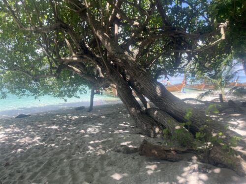 ビーチぞいには影を落とす大きな木が並んでいて、木陰に座ってのんびりと海を眺めることができます。