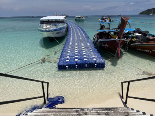 みんな靴を脱いで海に入って桟橋まで渡るのですが、、、、この桟橋が灼熱の熱さなのです!🔥