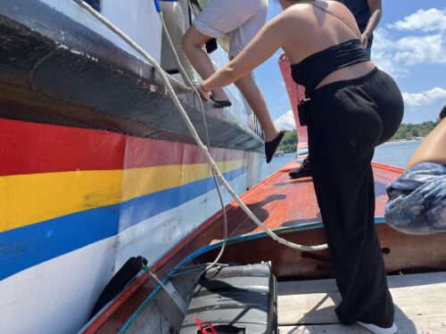 大型の船はビーチに接岸することができないので、まずは小型船で少人数ずつ渡してもらうことに。